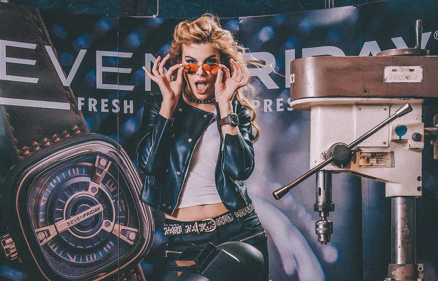 Foto editorijal kreiran za „on-line“ prezentaciju „luxury & lifestyle“ brenda SEVENFRIDAY insipirisan je industrijskim okruženjem, mašinama i „biker“ stilom.